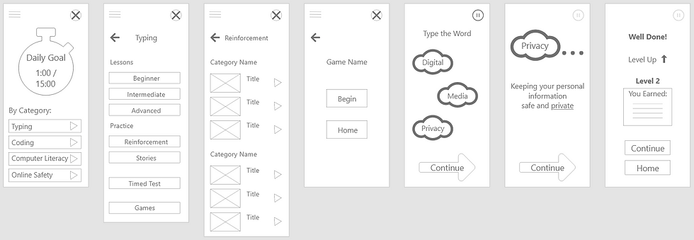 To prepare for usability testing, I created a low-fidelity prototype that connected the user flow of selecting a category and completing a minigame related to the category chosen.
